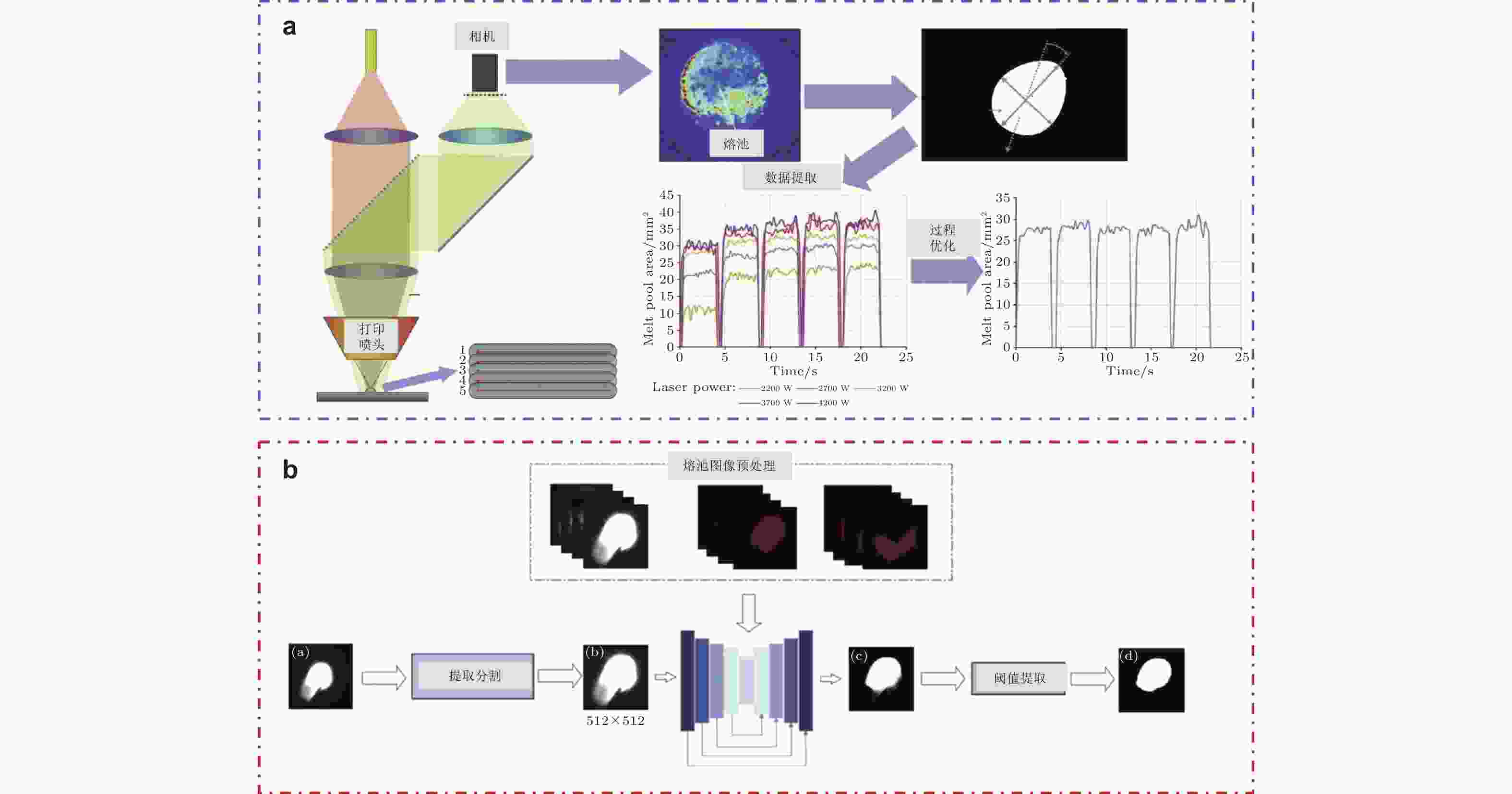 图 4 (a)同轴相机的熔池监测装置及熔池几何特征(Da Silva et al. 2023), (b)熔池信息的处理流程: 基于深度学习的熔池分割(Yang et al. 2025)