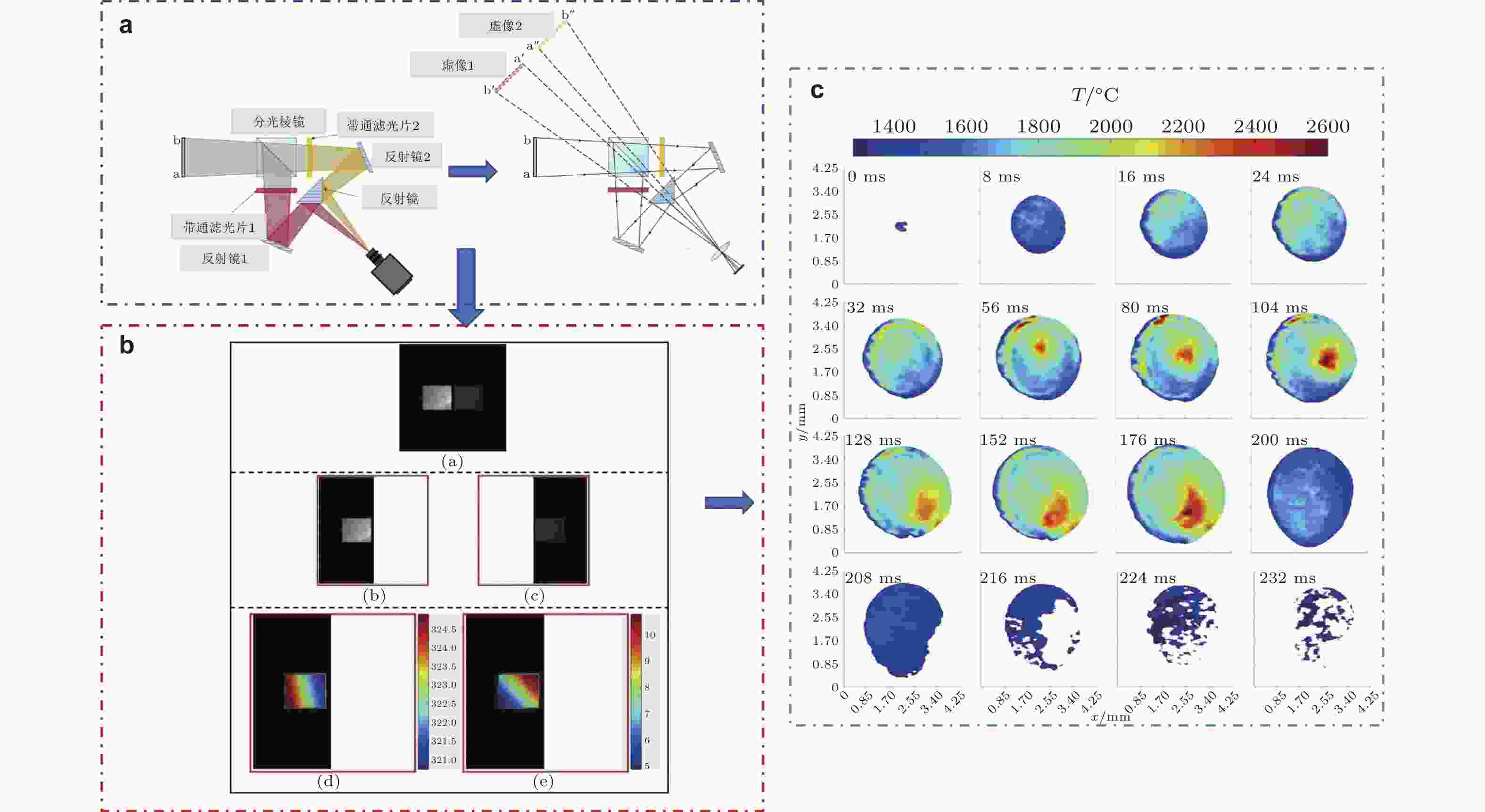 图 5 基于光学检测的双波段比色测温法获取熔池温度场流程示意图.(a)双波段分光光路(Hao et al. 2020), (b)基于DIC的双波段图像匹配方法(Ma et al. 2022), (c)温度场测量结果(Hao et al. 2020)