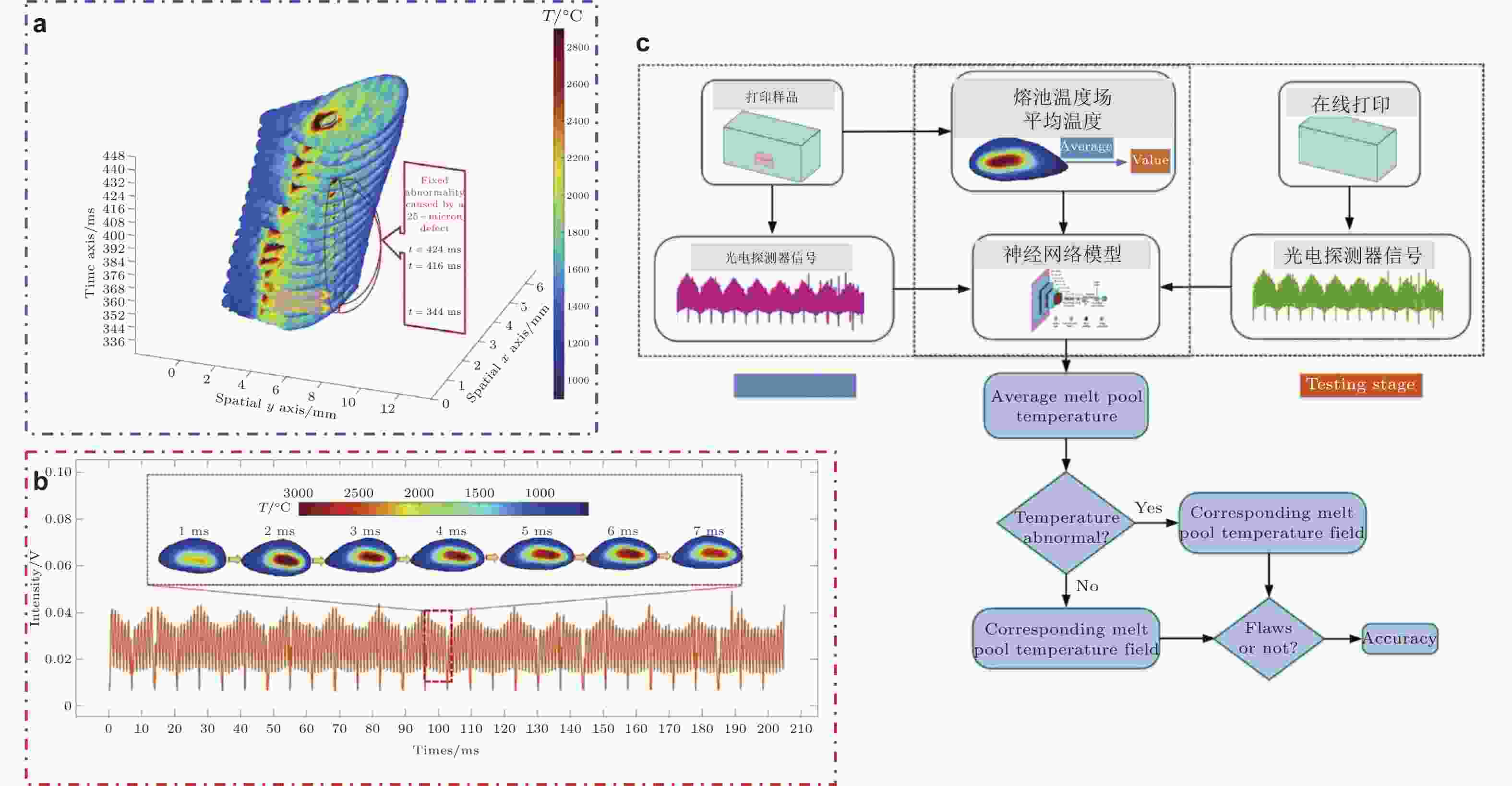 图 6 (a)基于温度场相似性(TDSD)的缺陷原位检测(Feng et al. 2022b), (b)基于光电二极管的熔池温度时间序列检测及(c)基于深度学习的激光粉末床熔融中连续缺陷检测(Mao et al. 2023)