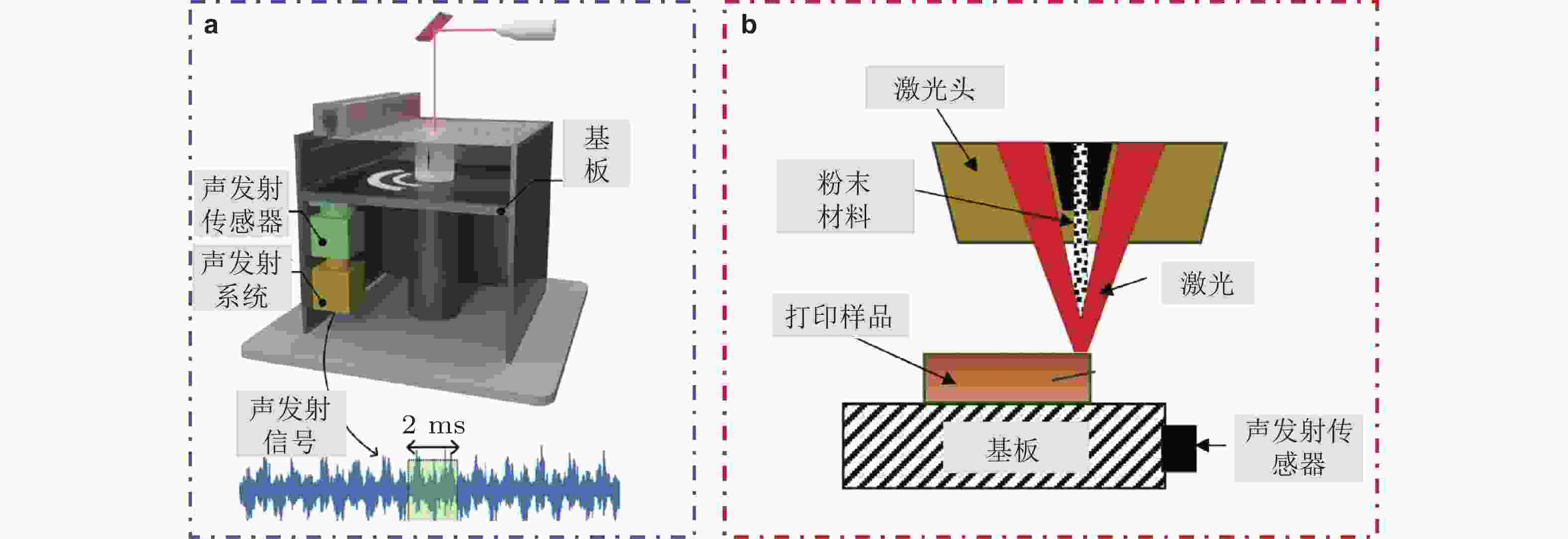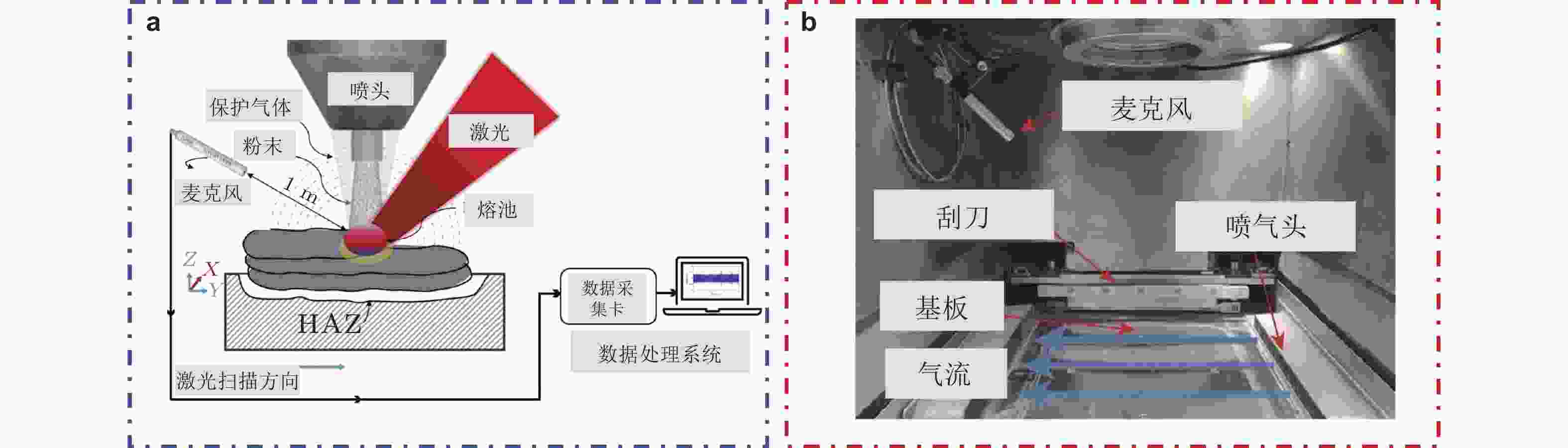 图 8 麦克风检测设备. (a)用于LDED工艺的麦克风检测示意图(Ansari et al. 2025), (b)用于LPBF的麦克风检测装置(Chen et al. 2023d)