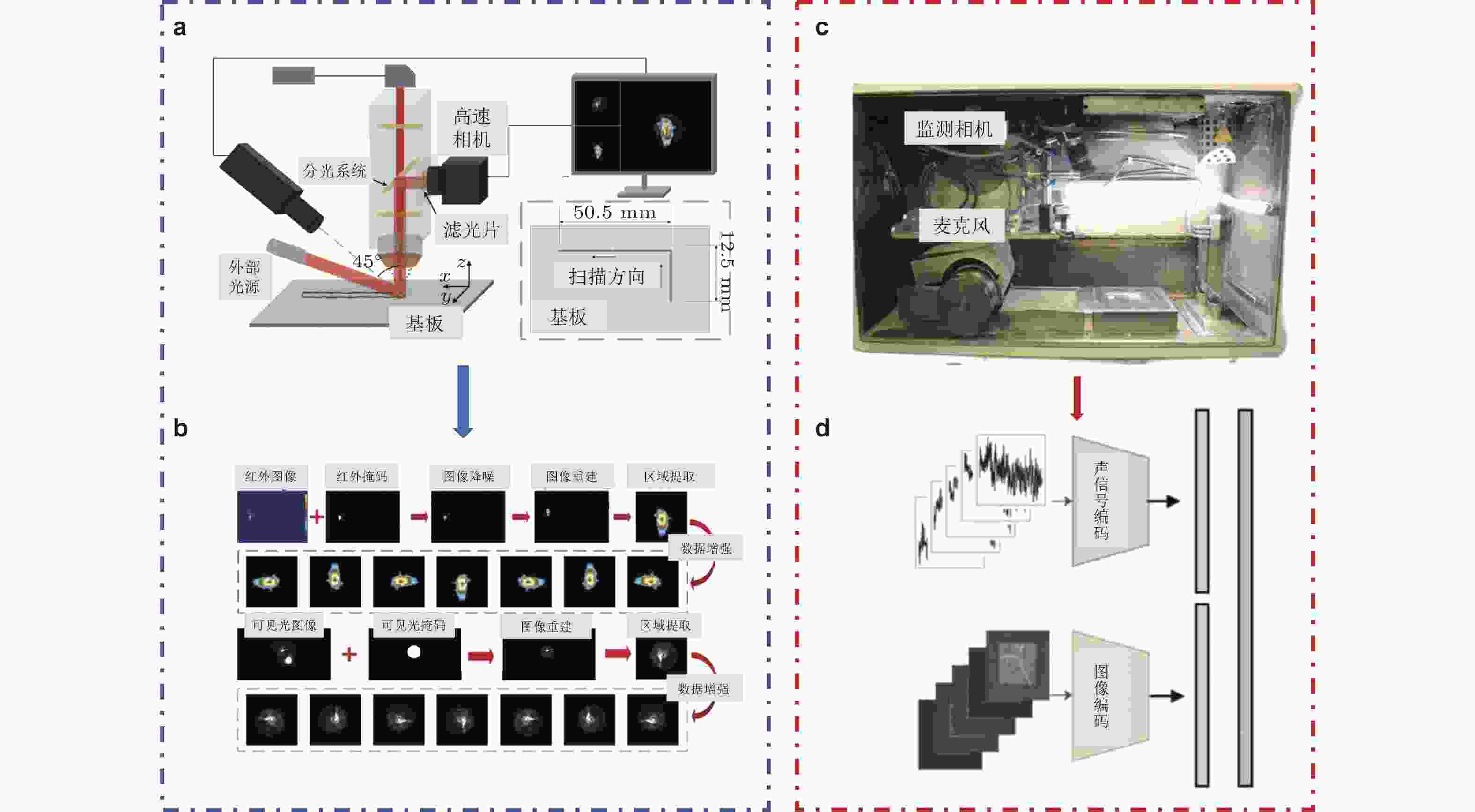 图 9 多传感器检测系统检测流程示意图. (a)用于LDED工艺的多传感器监测系统: 同轴相机和麦克风监测(Ren et al. 2025), (b)(d)基于深度学习方法的熔池图像与声信号的融合,(c)用于LPBF工艺的麦克风、相机监测设备(McKinney et al. 2025)