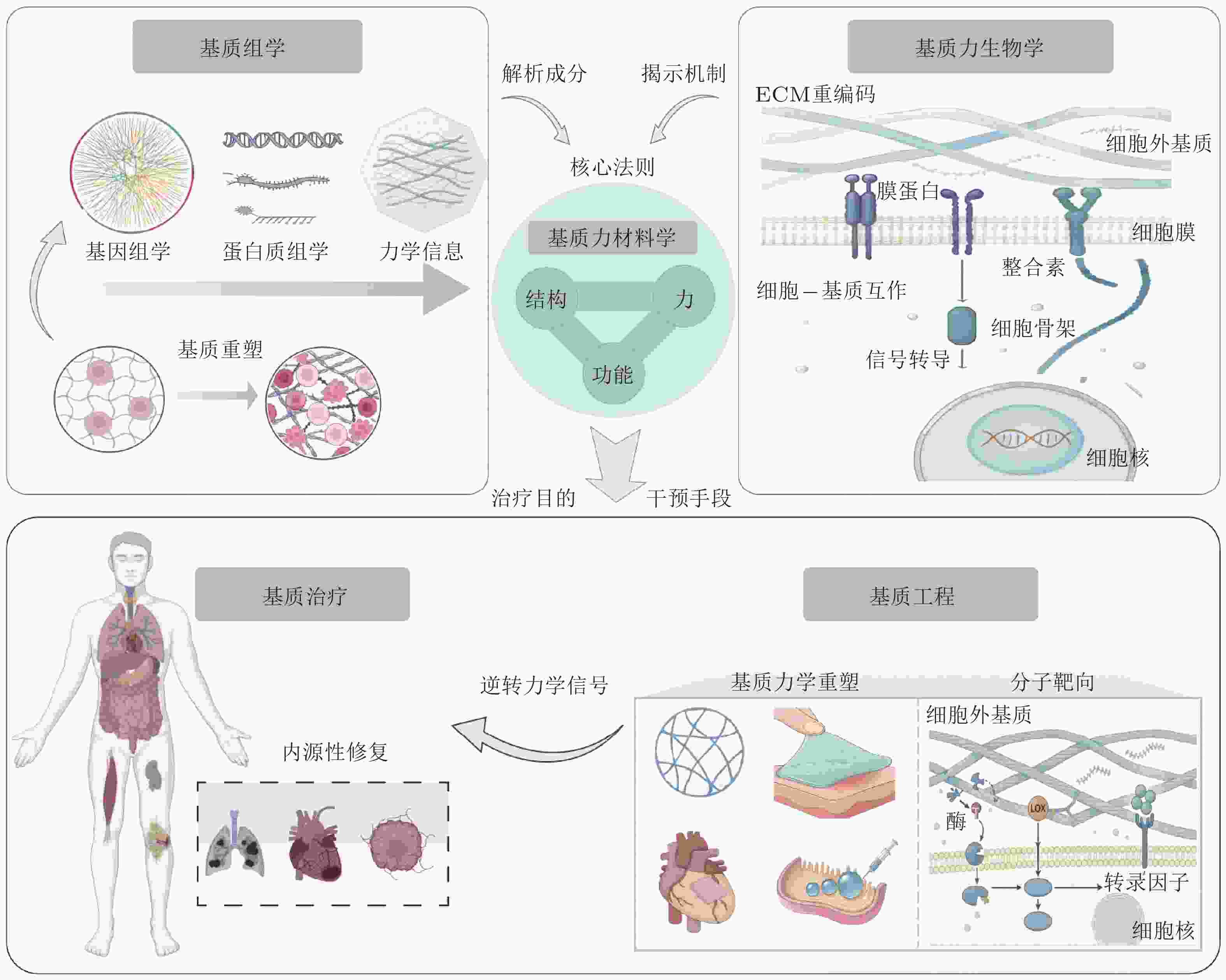 摘要: 随着全球人口老龄化和慢性病的高发, 心血管疾病、肿瘤、糖尿病等重大难治性疾病已成为全球公共健康和社会经济发展的主要挑战. 其病理进程通常伴随着细胞外基质(ECM)的异常重塑与力学稳态失衡, 导致传统治疗方法难以有效逆转. 近期研究揭示, 结合材料学与工程学原理主动调控ECM的力化属性以精准介导细胞行为, 能够有效激活组织内源性修复从而显著促进组织再生. 该研究策略被称为力材料学, 即通过对材料进行主动设计, 利用力−结构−功能关系对生命系统的力学环境进行主动控制. 基于此概念, 本文提出从基质组学角度系统鉴定ECM的分子组成并解构其力学信息编码; 利用基质力生物学认识细胞-ECM互作机制并解析病理ECM“重编码”过程; 在深入认知和理解ECM力学微环境基础上结合基质力材料学的研究思路, 探索对异常ECM“去编码”与功能恢复的基质工程技术; 最终实现组织内源性修复的基质治疗目的. 具体而言, 本文在介绍ECM的组成与动态编码的基础上, 系统总结了异常ECM力学微环境的生理/病理变化, 着重提出并构建基于分子靶向与材料重建的基质工程与治疗新策略, 旨在为重大难治性疾病的干预和再生医学的发展提供新的理论依据和创新思路.Abstract: With the global aging population and high incidence of chronic diseases, major intractable conditions such as cardiovascular diseases, tumors, and diabetes have become primary challenges to public health and socioeconomic development worldwide. Their pathological processes are often accompanied by abnormal remodeling of the extracellular matrix (ECM) and disruption of mechanical homeostasis, rendering traditional treatments ineffective in reversing these conditions. Recent studies reveal that actively modulating the mechanical properties of the ECM through principles of materials science and engineering to precisely mediate cellular behavior can effectively activate endogenous tissue repair, significantly promoting tissue regeneration. This research strategy, termed force-materials science, involves actively designing materials to leverage force-structure-function relationships for proactive control of the mechanical environment within biological systems. Based on this concept, this paper proposes: systematically identifying the molecular composition of the ECM from a matrixomics perspective and deconstructing its mechanical information encoding; utilizing matrix biomechanics to understand cell-ECM interaction mechanisms and decipher pathological ECM “re-encoding” processes; and, grounded in deep understanding of the ECM's mechanical microenvironment, exploring matrix engineering technologies for “de-encoding” abnormal ECM and restoring function by integrating matrix biomechanics principles. ultimately achieving the goal of matrix therapy for endogenous tissue repair. Specifically, this paper introduces the composition and dynamic coding of the ECM, systematically summarizes the physiological/pathological changes in abnormal ECM mechanical microenvironments, and emphasizes the proposal and construction of novel matrix engineering and therapeutic strategies based on molecular targeting and material reconstruction. These efforts aim to provide new theoretical foundations and innovative approaches for the intervention of major intractable diseases and the advancement of regenerative medicine.