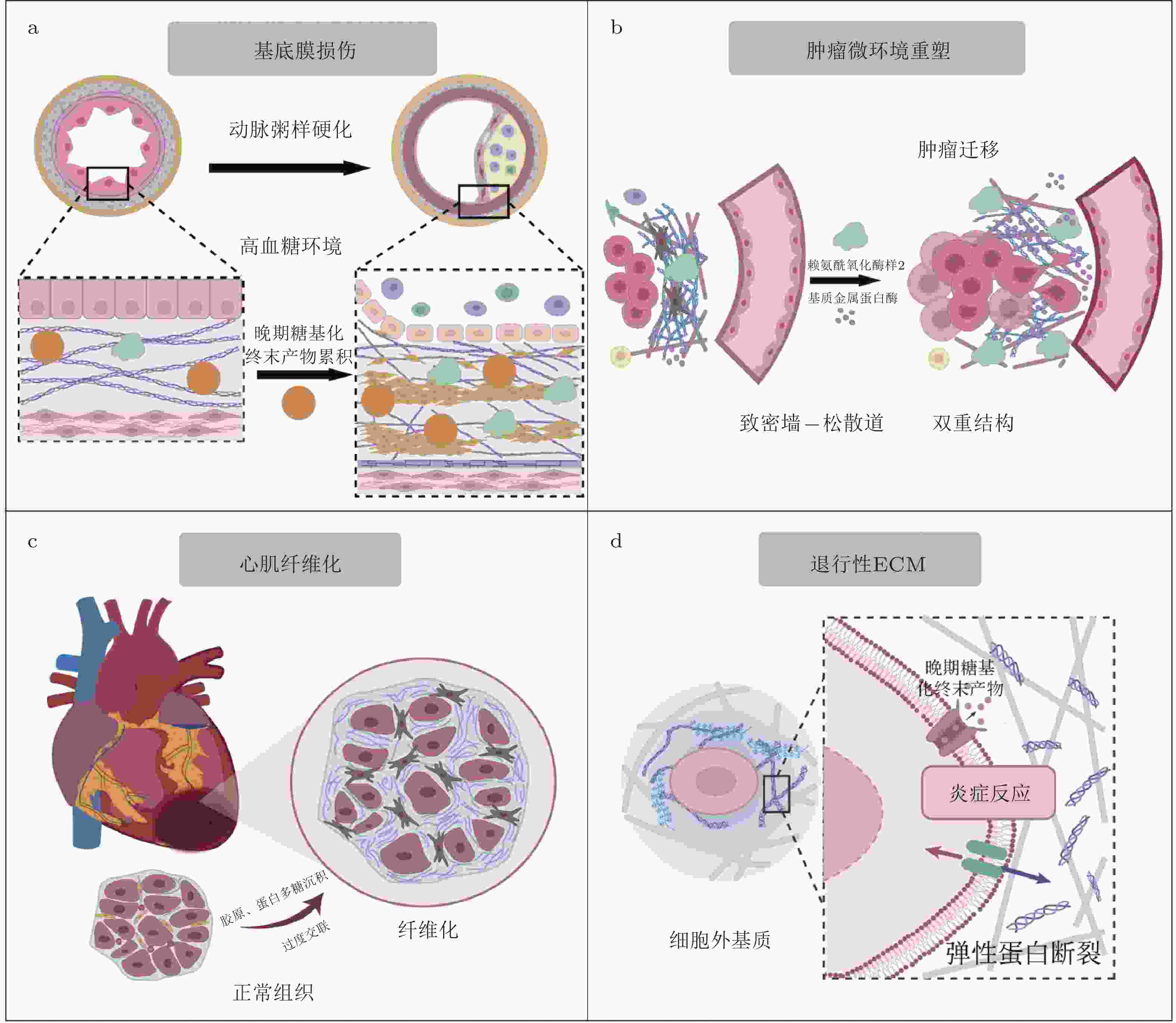 过程.层粘连蛋白 Laminin ECM中的重要糖蛋白, 参与基底膜的结构稳定和细胞粘附. 整合素 Integrins 一类细胞膜受体, 参与细胞与ECM的连接, 调节细胞的形态、迁移、增殖和存活. 胶原蛋白 Collagen ECM中最重要的蛋白之一, 提供结构支持, 影响组织的强度和弹性. 纤维连接蛋白 Fibronectin ECM中的重要糖蛋白, 参与细胞粘附、迁移及信号转导. 基质金属蛋白酶 Matrix Metalloproteinases (MMP) 基质金属蛋白酶, 降解ECM蛋白质, 参与组织重塑、伤口愈合及肿瘤转移等过程. 基质金属蛋白酶抑制因子 Tissue Inhibitors of Metalloproteinases (TIMP) 一类抑制基质金属蛋白酶的蛋白, 调节ECM的降解. 成纤维细胞 Fibroblasts 负责合成和分泌ECM成分的细胞, 尤其在组织修复和纤维化过程中发挥重要作用. 肌成纤维细胞 Myofibroblasts 成纤维细胞的一种类型, 具有类似平滑肌的功能, 在纤维化组织中发挥重要作用. 转化生长因子β Transforming Growth Factor-beta (TGF-β) 一类多功能细胞因子, 参与细胞的增殖、分化、迁移等过程, 在纤维化、肿瘤发展等中发挥重要作用. 晚期糖基化终产物 Advanced Glycation End Products (AGEs) 糖化反应过程中生成的产物, 与多种衰老和退行性疾病相关. JNK JNK (c-Jun N-terminal Kinase) 一类MAPK家族的激酶, 参与细胞应激反应、炎症及细胞凋亡. RAGE受体 RAGE (Receptor for AGEs) 一种细胞表面受体, 能识别晚期糖基化终产物, 参与慢性炎症反应及多种疾病的进展. YAP/TAZ