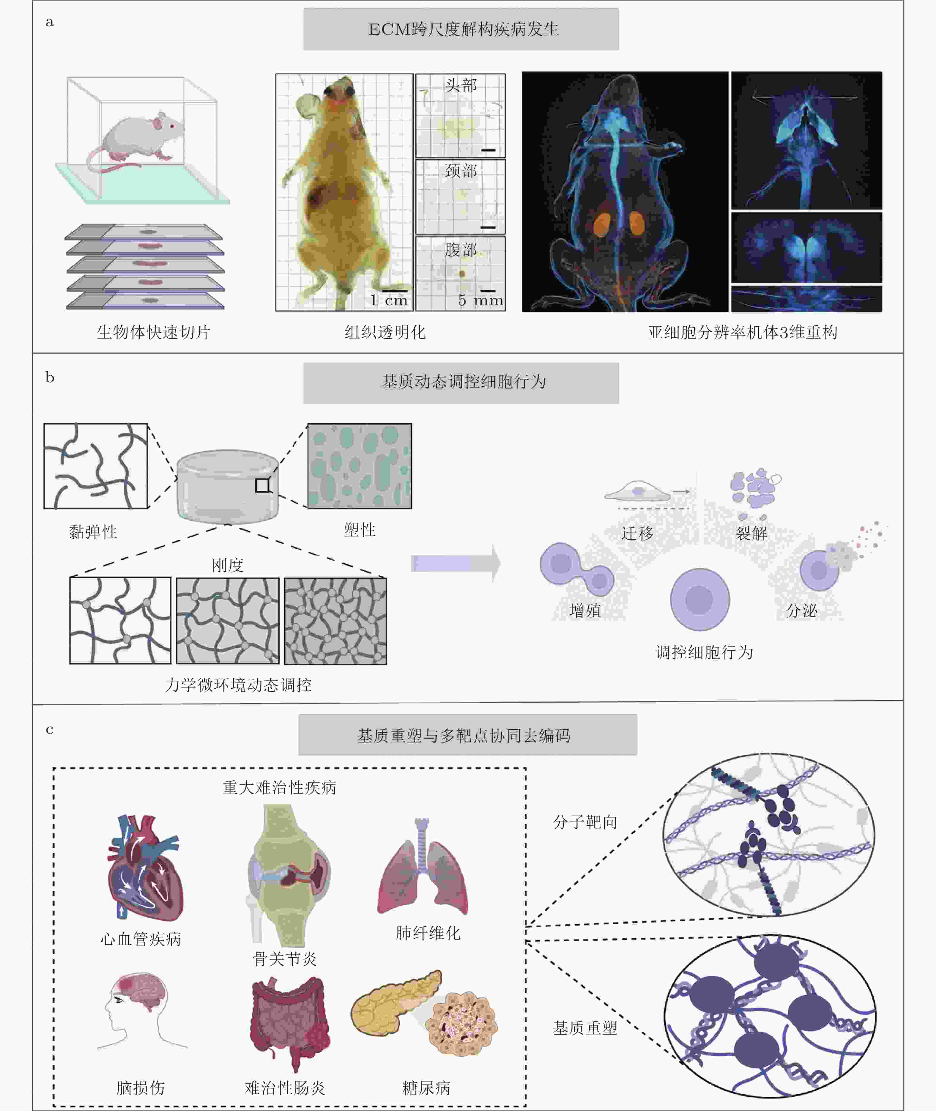图 5 基质工程与基质治疗潜在应用. (a) ECM跨尺度解构疾病发生: 利用高分辨率整体成像建立从微观分子交联到宏观组织力学特性的全景力学图谱(Shi et al. 2025). (b)动态调控细胞行为: 通过光控水凝胶等智能技术, 在时间和空间维度上模拟生理或病理的动态力学变化. (c)基质力学重塑与多靶点协同去编码: 通过智能响应平台将基质力学重塑与分子靶向治疗深度融合, 实现复杂组织的内源性修复与功能再生