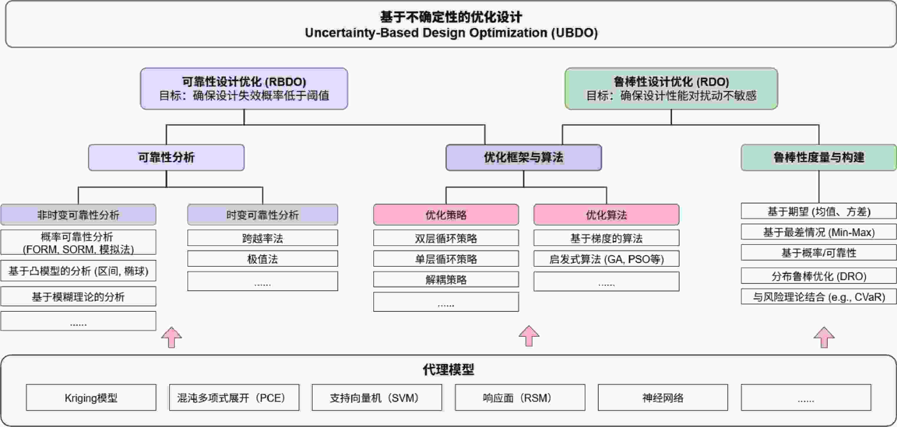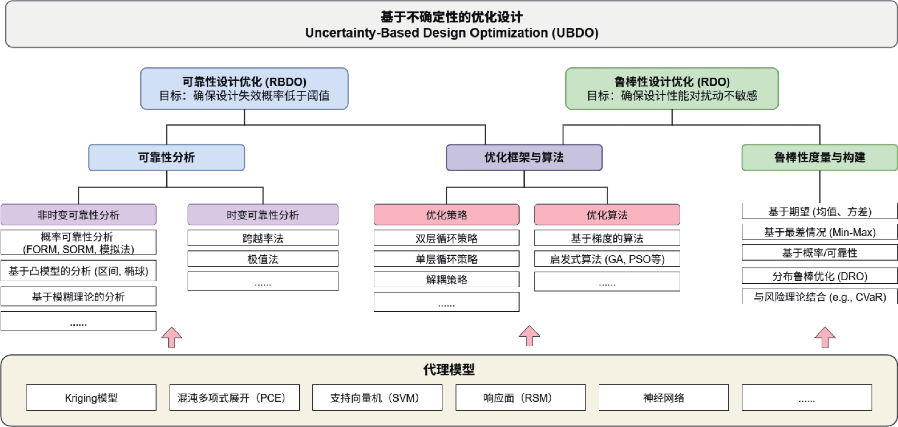 利用Hermite (随机) 和Legendre (区间) 多项式构建混合PCE. 采用稀疏网格积分计算系数, 再用遗传算法在PCE上寻优.非侵入式PCE无需修改原求解器, 便于与商业软件耦合; 稀疏网格策略缓解了中等维度下的“维数灾难”, 兼顾计算精度与效率. Wang & Matthies (2020) 分布参数模糊的随机模型 + RBF + 二分法