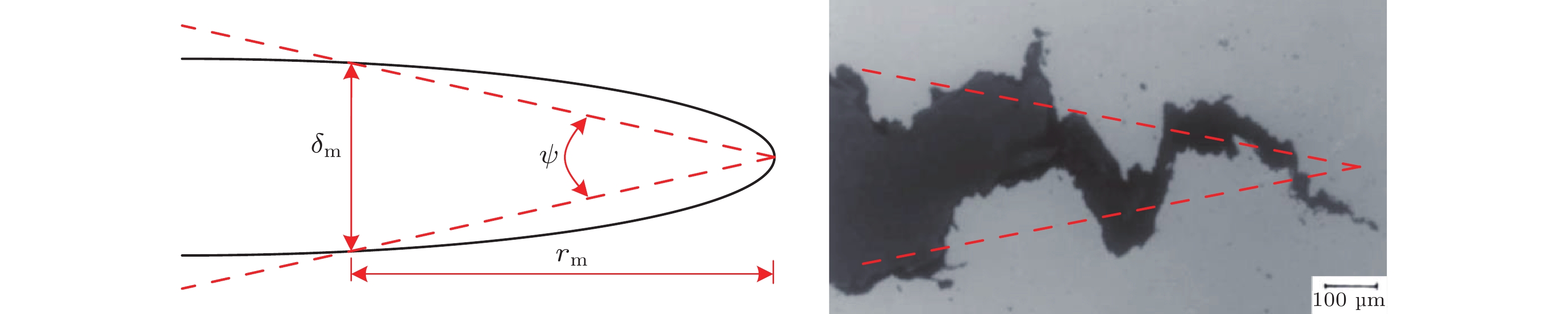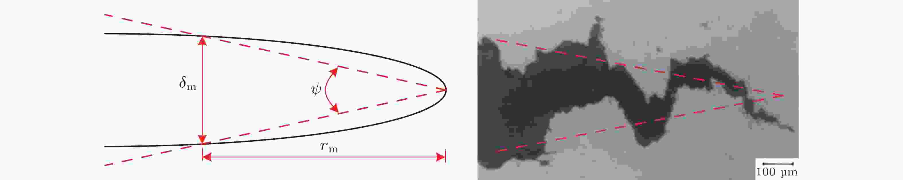 图  16  CTOA的工程定义与裂纹面的三角形等效 (右图为A710高强度低合金钢韧性裂纹扩展的光学显微照片, 引自McMeeking & Parks 1979)