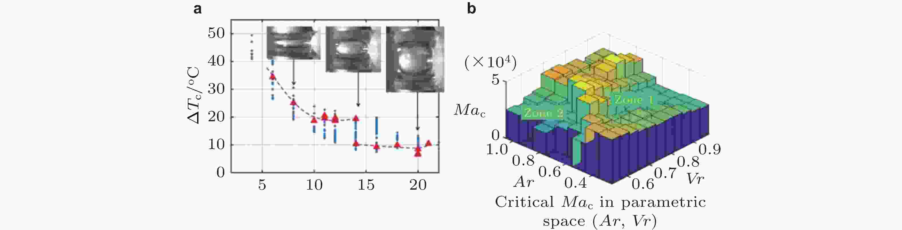 图 1 液桥高径比−体积比效应图谱. (a) 高径比对临界温差的影响, (b) 高径比与体积比对临界Marangoni数的影响(Kang et al. 2019c)
