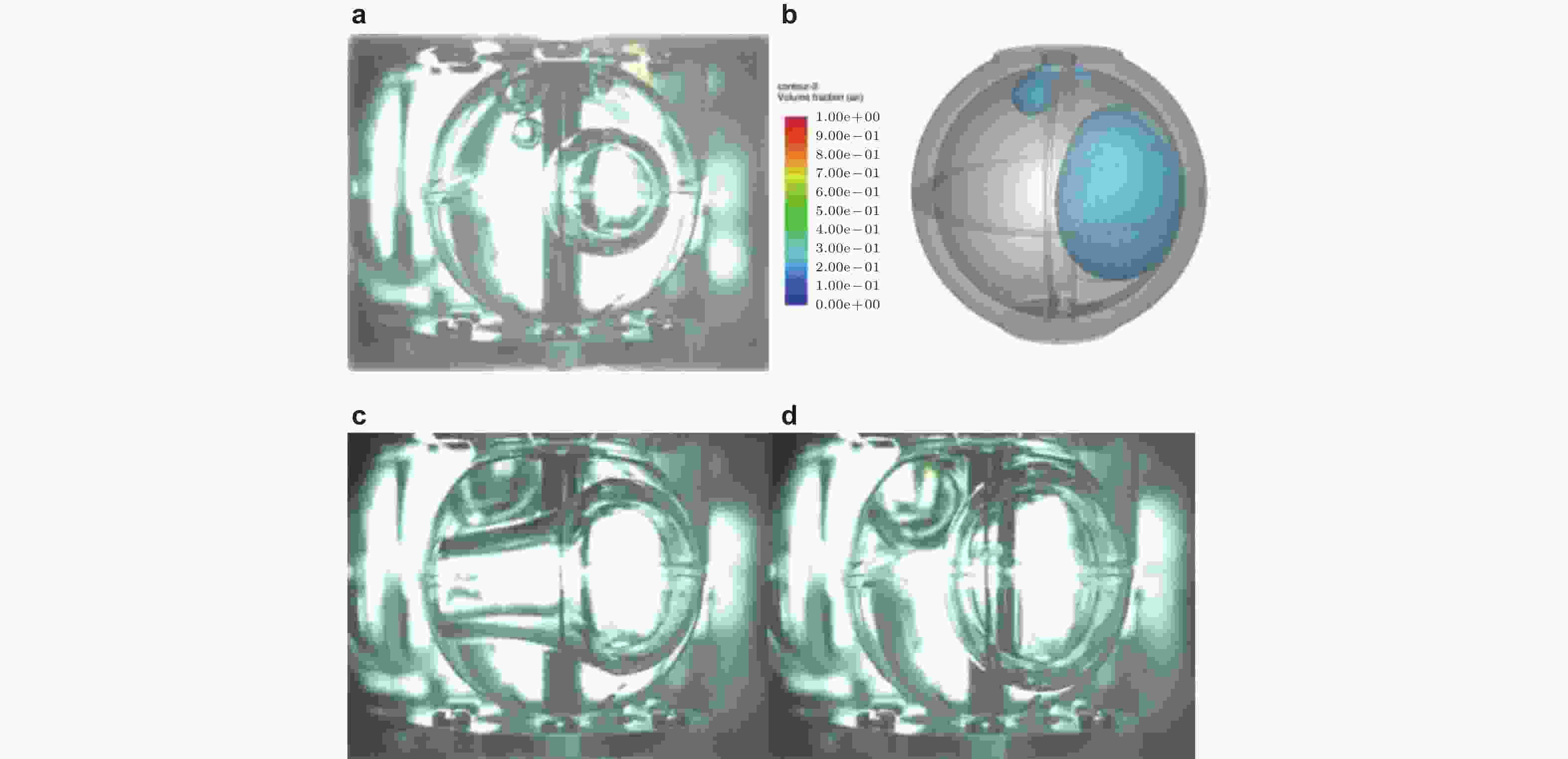 图 2 中国空间站流体物理实验柜贮箱气泡合并现象实验. (a) 实验结果, (b) 数值仿真, (c) 气泡合并过程, (d)气泡稳定状态 (Chen S et al. 2024a)