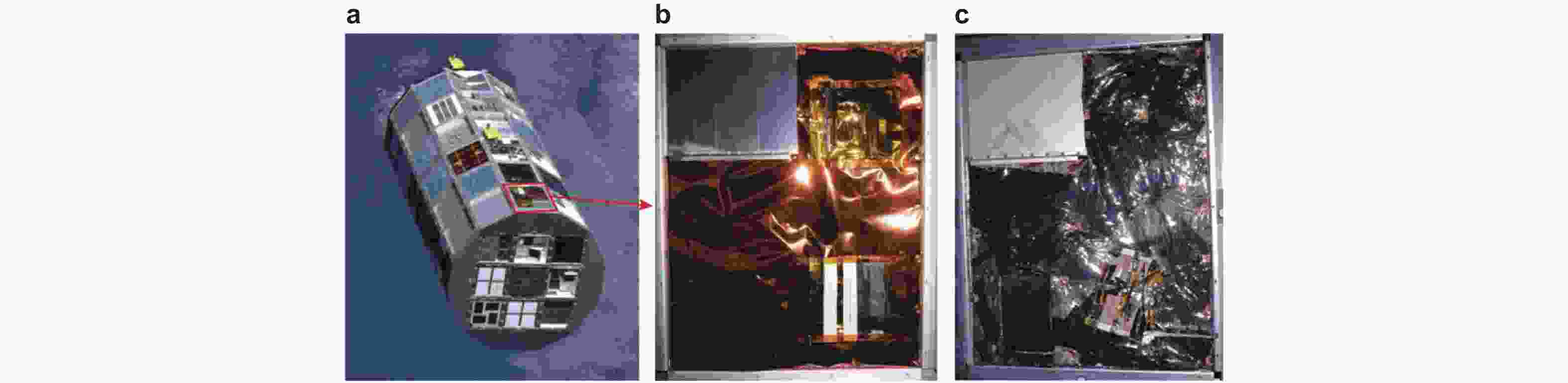 图 8 NASA长期暴露试验卫星侵蚀形貌变化(NASA 1989). (a) 卫星全景, (b) 发射前状态, (c) 暴露5.8年后状态
