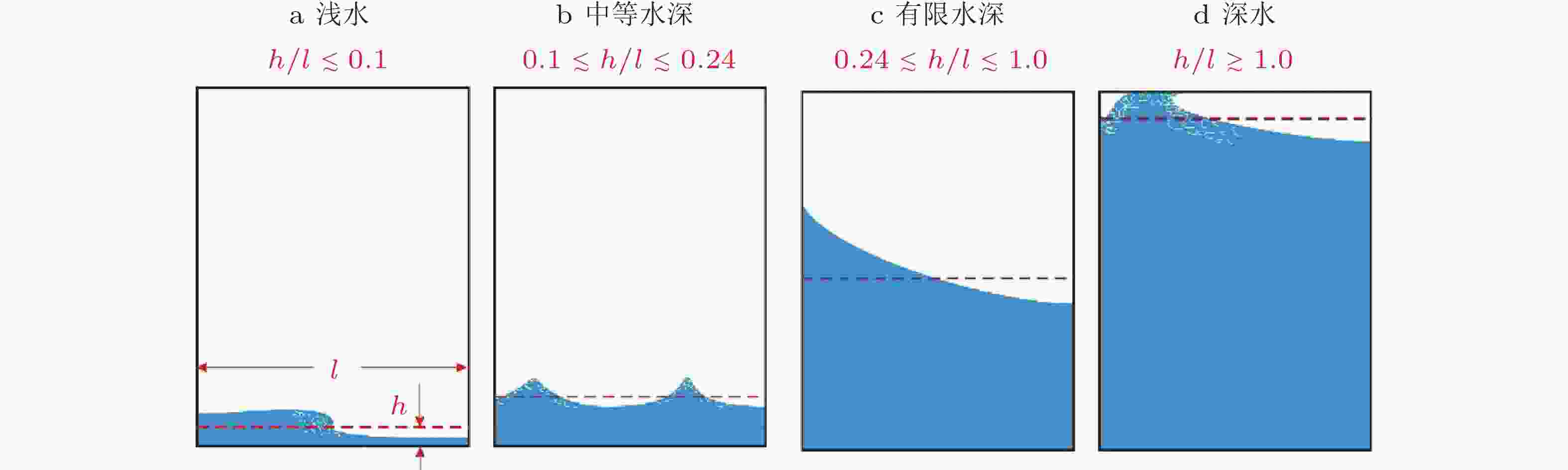 图  3  二维矩形储罐在共振附近不同水深下的典型晃荡运动. (a) 浅水, (b) 中等水深, (c) 有限水深, (d) 深水