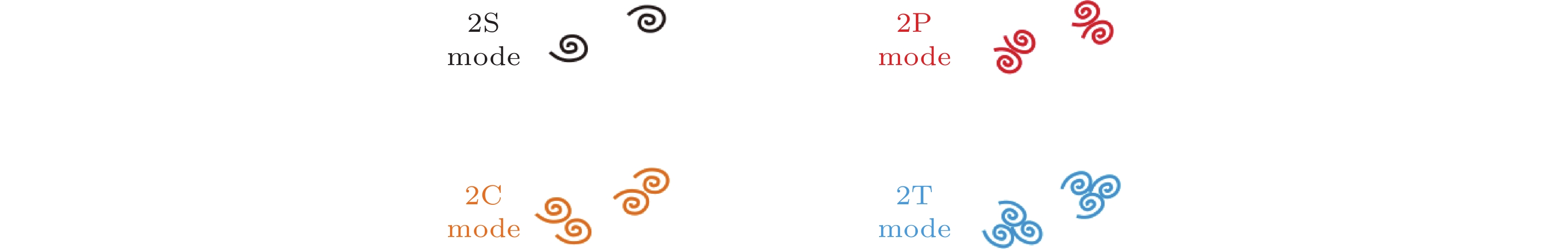 图  5  锁定状态下的涡脱离模式示意图: 2S模式、2P模式、2C模式以及2T模式